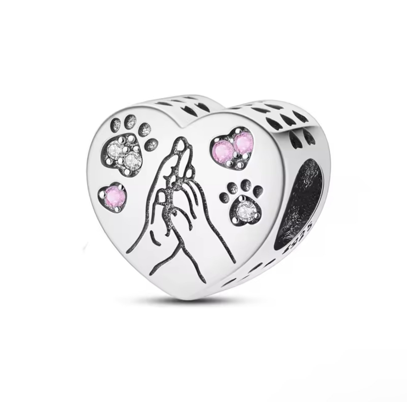 Celebrate the unbreakable bond between humans and their furry companions with our beautifully crafted “Forever Connected” Heart Charm. Made from high-quality 925 sterling silver, this heart-shaped charm features an intricate engraving of a hand and paw gently touching—symbolizing love, loyalty, and companionship. Accented with sparkling cubic zirconia and soft pink stones, it also includes delicate paw print details that add a touch of playful elegance. This charm is compatible with most major bracelet brands and makes a thoughtful gift for pet lovers or a meaningful addition to your own collection.